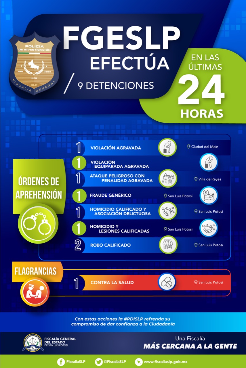 SLP. – La Policía de Investigación (PDI) de la Fiscalía General del Estado (FGE) llevó a cabo la detención de nueve personas que estarían relacionados en la comisión de ilícitos graves en San Luis Potosí.
