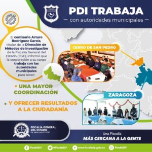 Dijo que, además, el objetivo es acercar la procuración de justicia a los ayuntamientos, instrucción que giró el Fiscal General del Estado, José Luis Ruiz Contreras, tanto a la PDI como las y los delegados del interior de San Luis Potosí.
