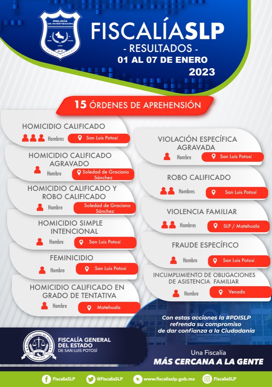 Del 1 al 7 de enero del 2023, la Fiscalía General del Estado de San Luis Potosí (FGESLP) logró la aprehensión y el encarcelamiento de seis hombres señalados por homicidio.