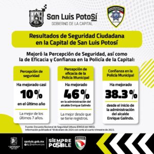 En un destacado hito para la seguridad pública, la confianza en la Policía Municipal de San Luis Potosí ha alcanzado su punto más alto en la historia, registrando un impresionante aumento del 38.3% desde el inicio de la administración del Alcalde Enrique Galindo Ceballos, según datos de la Encuesta Nacional de Seguridad Urbana (ENSU) del Inegi al cuarto trimestre de 2023.