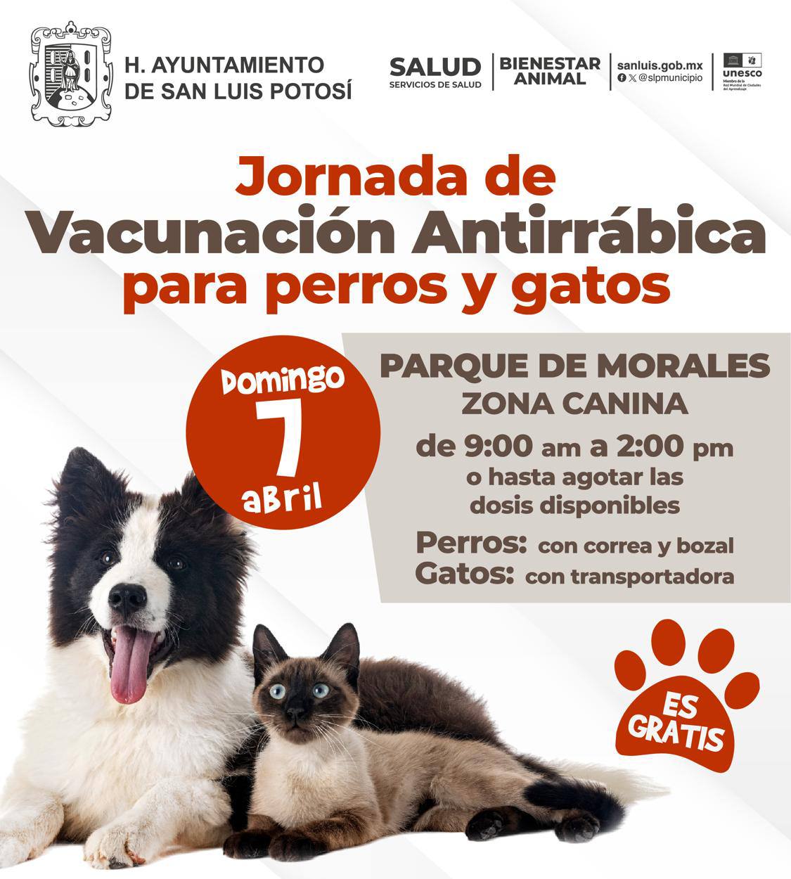 El Gobierno Municipal de San Luis Potosí se suma a la Jornada Nacional de Vacunación Antirrábica Canina y Felina 2024, con la aplicación gratuita de 3 mil dosis de vacuna a animales de compañía. El evento tendrá lugar el domingo 7 de abril en la zona canina del parque Morales.