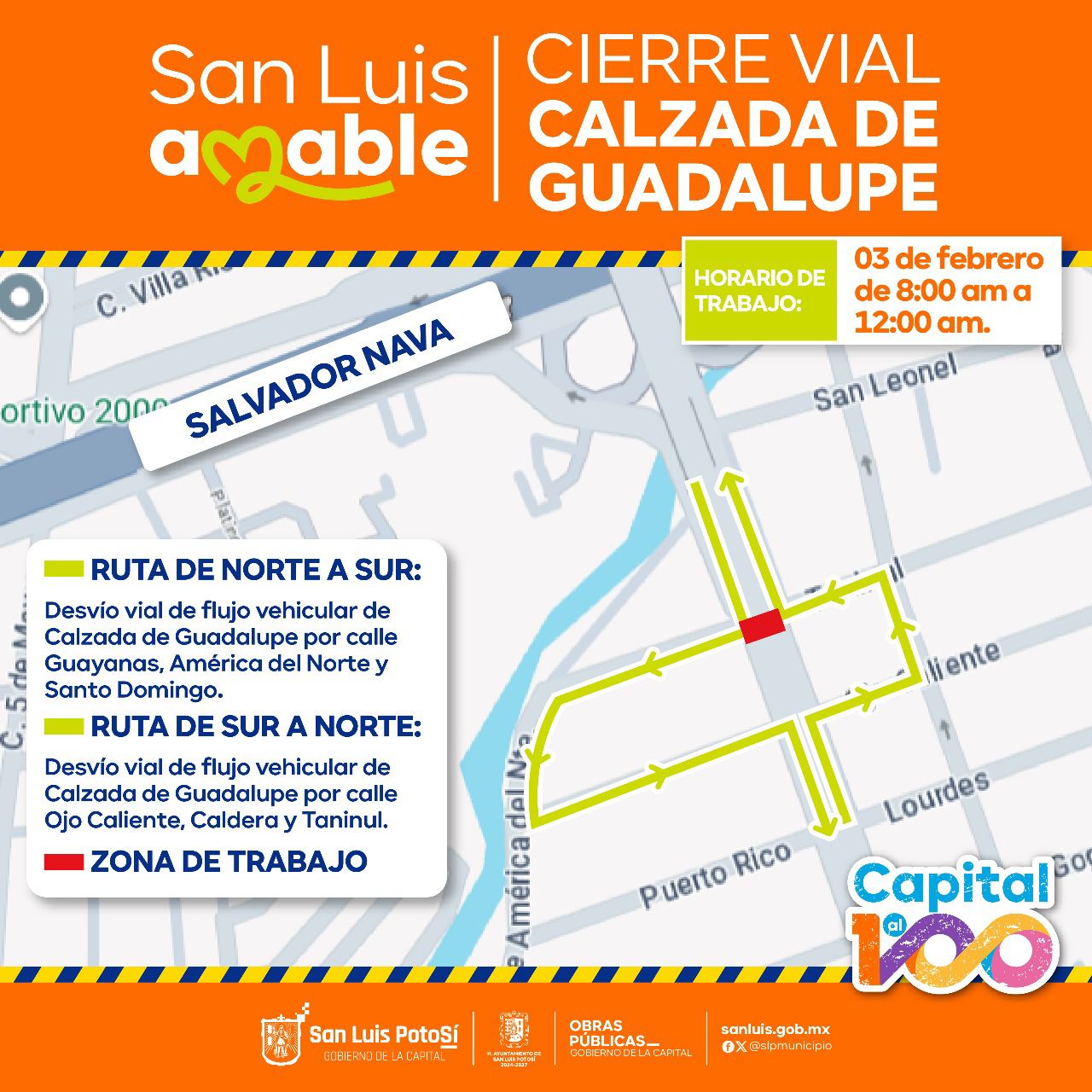 La Secretaría de Seguridad y Protección Ciudadana (SSPC) informó que este lunes 3 de febrero, se implementará un cierre vial temporal en la zona de Calzada de Guadalupe y calle Taninul, debido a trabajos de conexión de un pozo profundo que realizará la Dirección de Obras Públicas del Ayuntamiento.