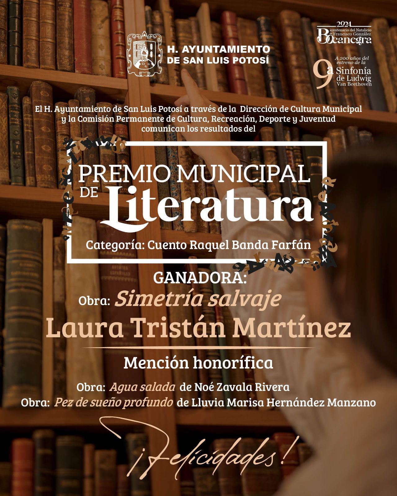 En la categoría de Cuento “Raquel Banda Farfán”, la obra «Simetría Salvaje», de la escritora Laura Tristán Martínez, se alzó con el primer lugar, destacando por su lenguaje poético y su envolvente narrativa. Asimismo, se otorgaron menciones honoríficas para “Agua salada” de Noé Zavala Rivera y “Pez de sueño profundo” de Lluvia Marisa Hernández Manzano.