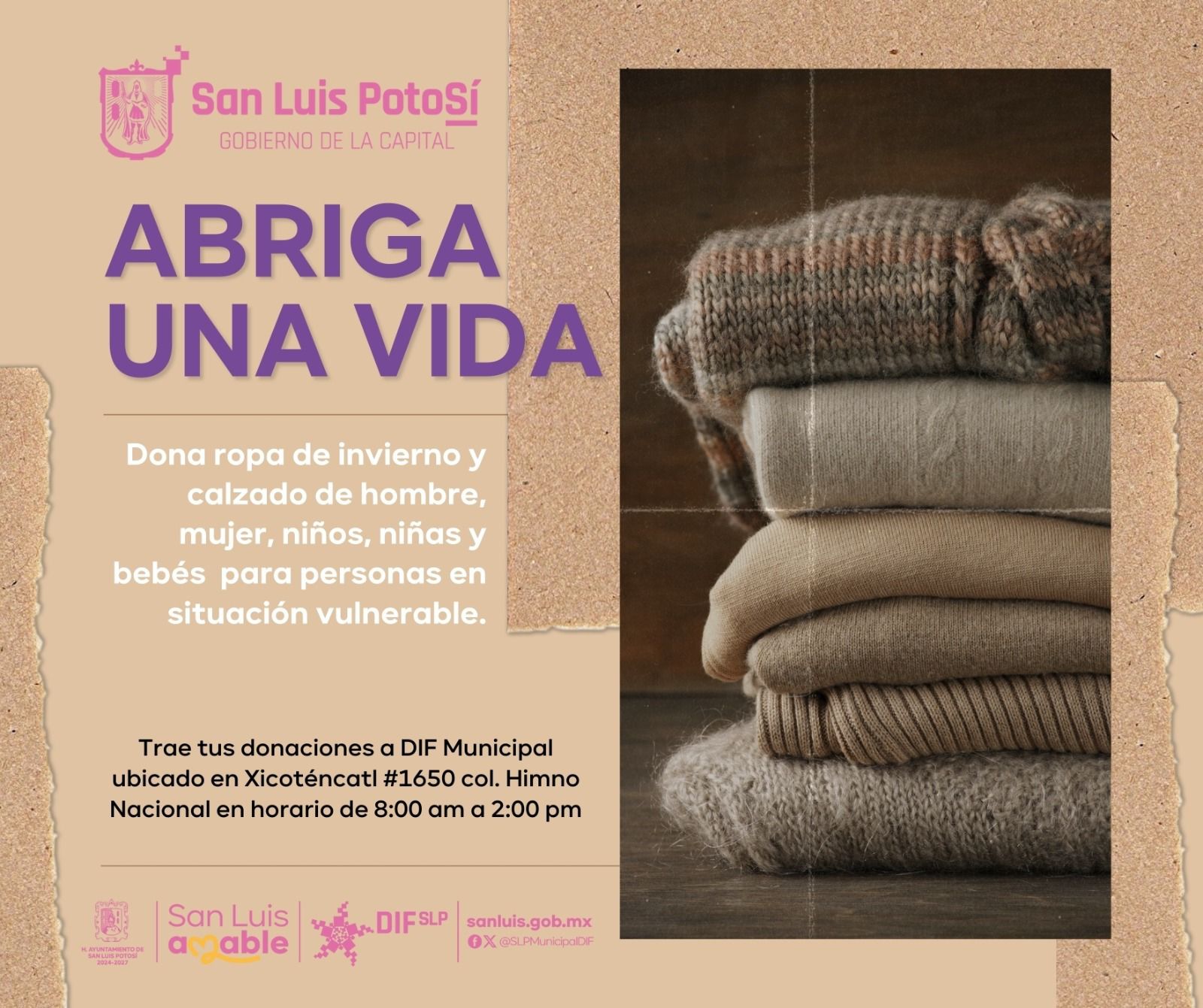 SLP.- Ante la presencia de bajas temperaturas que se avecinan, el Sistema Municipal DIF puso en marcha la campaña “Abriga una vida”, con el objetivo de recabar cobijas y ropa abrigadora en beneficio de población en situación vulnerable.