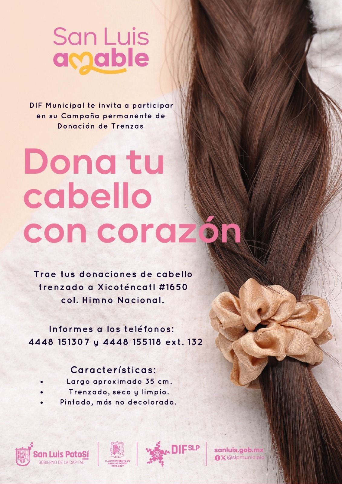 Asímismo, la titular del DIF Capitalino, Estela Arriaga, invita a la ciudadanía a sumarse con la donación de cabello, el cual será destinado a la elaboración de pelucas que contribuyan a mejorar la calidad de vida y la autoestima de quienes más lo necesitan. Mayores informes: 444 8151307 y 444 8155118.