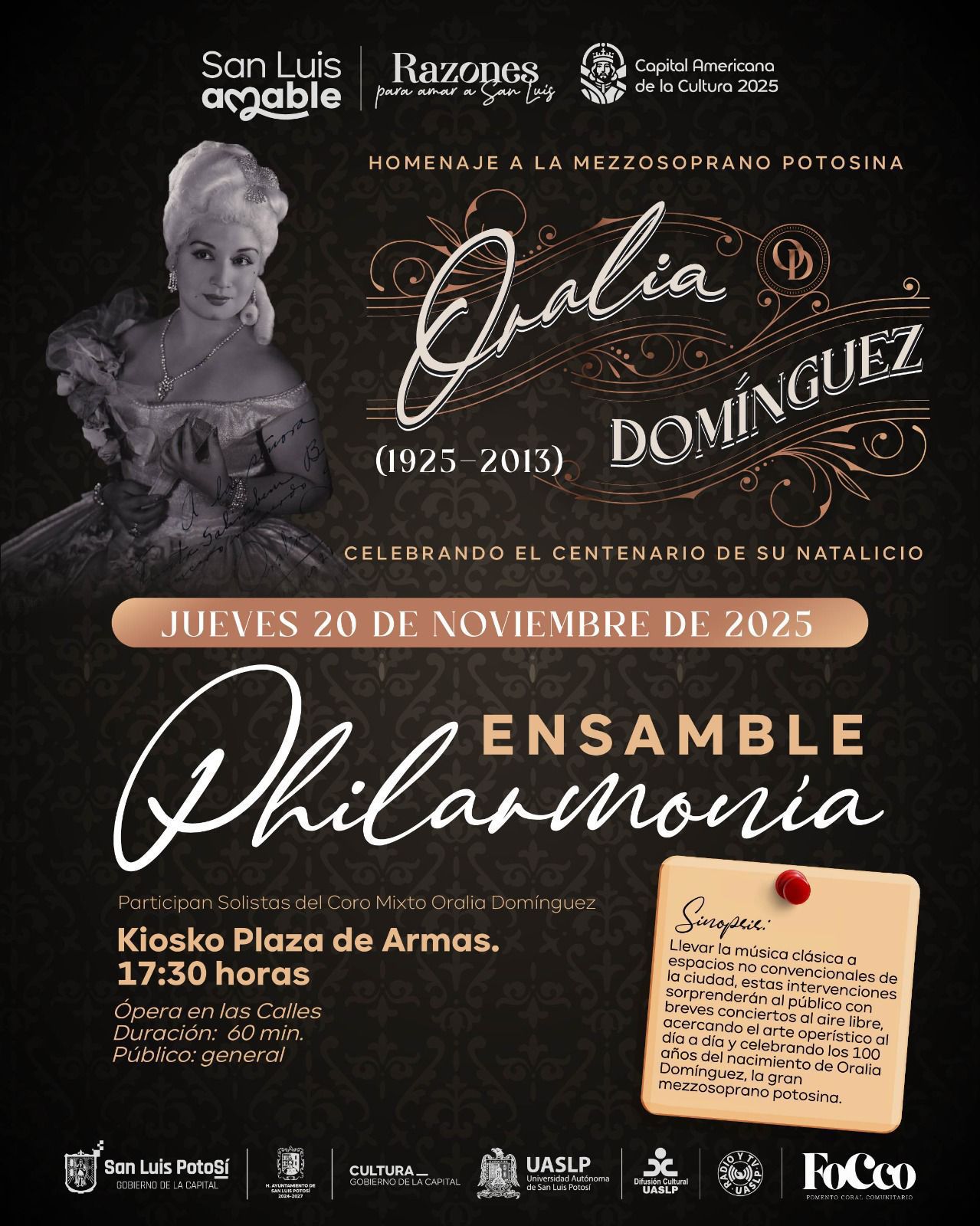 El Gobierno Municipal de San Luis Potosí, a través de la Dirección de Cultura Municipal, continúa fortaleciendo el programa especial de actividades en homenaje a la gran mezzosoprano potosina Oralia Domínguez, en el marco del centenario de su natalicio. Como parte de esta jornada conmemorativa, se invita al público en general a asistir este jueves 20 de noviembre de 2025, en punto de las 17:30 horas, a la intervención musical que se llevará a cabo en el Kiosco de Plaza de Armas, con la presentación del Ensamble Philarmonía San Luis y la participación de solistas del Coro Mixto Oralia Domínguez.