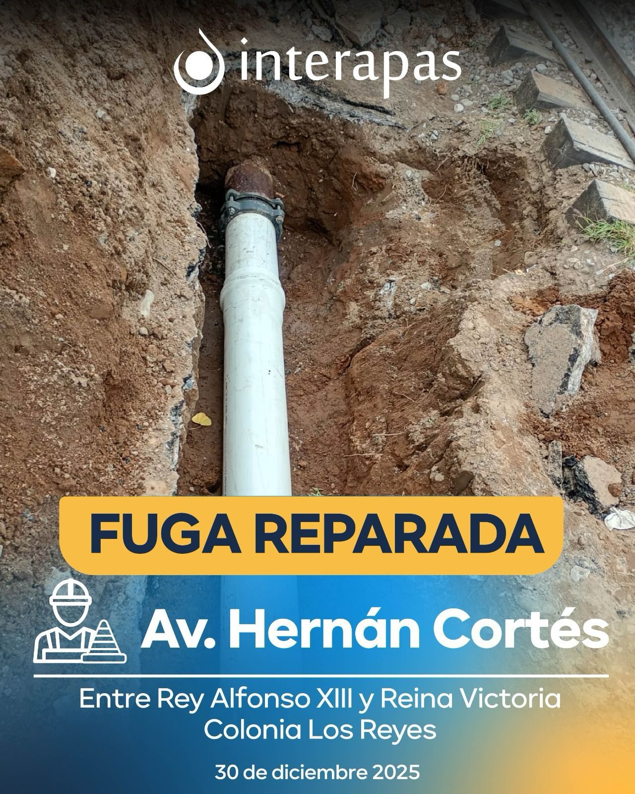 SLP.- Cuadrillas de la Dirección de Operación y Mantenimiento de INTERAPAS atendieron de manera oportuna una fuga de agua potable registrada en la avenida Hernán Cortés, entre las calles Rey Alfonso XIII y Reina Victoria, en la colonia Los Reyes.