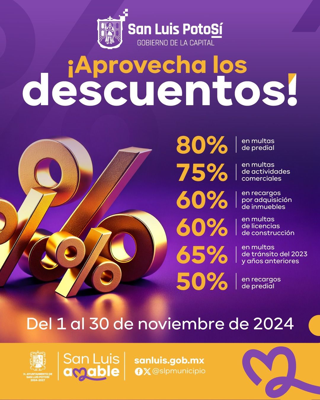 El Gobierno de la Capital invita a los contribuyentes a aprovechar los descuentos vigentes durante el mes de noviembre en el marco de la Campaña de Regularización de Contribuciones Municipales . El objetivo de esta campaña es que aquellos con adeudos regularicen su situación y, de este modo, se generen más recursos que serán destinados a obras y programas en beneficio de la ciudadanía potosina.