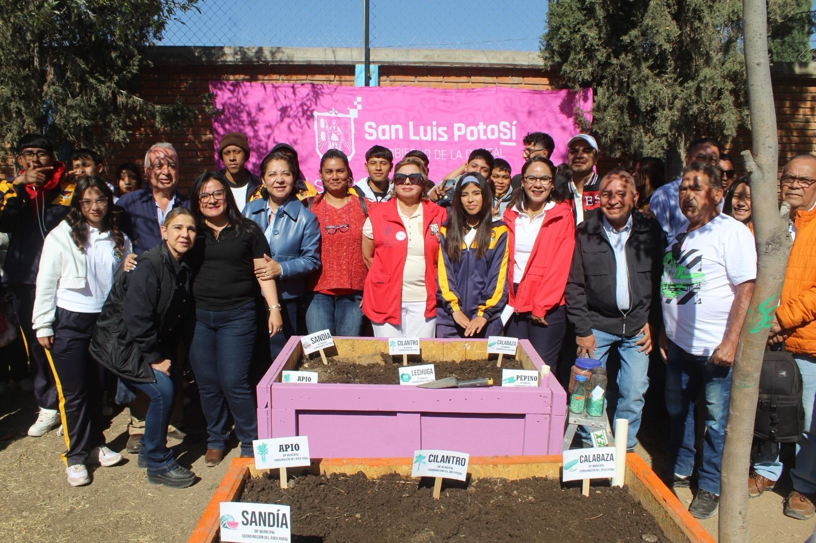 SLP.- La Presidenta del Sistema Municipal DIF, Estela Arriaga Márquez, felicitó a la comunidad educativa de la Preparatoria Municipal “Nueva Generación”, en la Delegación de La Pila, por continuar el fortalecimiento de su huerto al cambiar al sistema de cajones de auto riego por absorción.