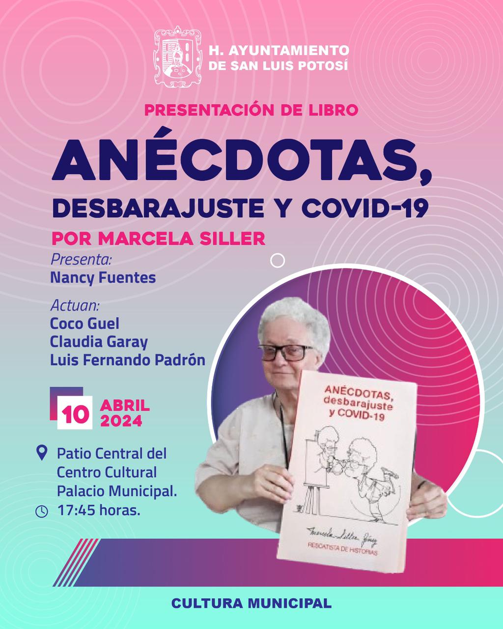 La Dirección de Cultura Municipal tiene el placer de invitar al público a la presentación del libro «Anécdotas, desbarajuste y Covid-19», de la destacada escritora potosina Marcela Siller. El evento tendrá lugar el miércoles 10 de abril del 2024 en el Centro Cultural Palacio Municipal, a las 17:45 horas.