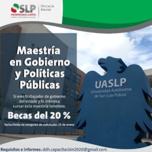 Con el objetivo de que las y los trabajadores de la administración pública estatal continúen su desarrollo personal y profesional, la Oficialía Mayor dio a conocer que continúa abierta la convocatoria para ser parte de la primera generación de la Maestría en Gobierno y Políticas Públicas que ofrece la Universidad Autónoma de San Luis Potosí (UASLP).