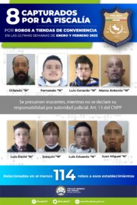 *SLP*. – En las últimas semanas, la Fiscalía General del Estado (FGE) realizó la captura de ocho personas, quienes presuntamente están involucradas en al menos 114 robos a tiendas de conveniencia en la Zona Metropolitana de San Luis Potosí.