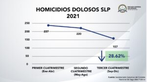 SLP. – Los últimos cuatros meses del 2021 reflejaron una baja del 28.63 por ciento en casos de homicidios dolosos, en relación a los dos cuatrimestres anteriores de ese año, informó la Fiscalía General del Estado de San Luis Potosí (FGESLP).