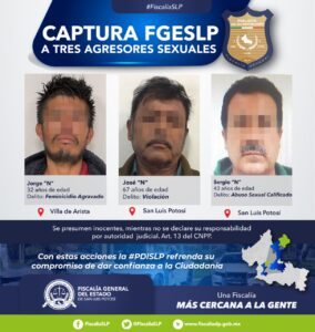 SLP. – La Fiscalía General del Estado (FGE) detuvo a tres hombres que estarían relacionados con agresiones sexuales a sus víctimas en San Luis Potosí.