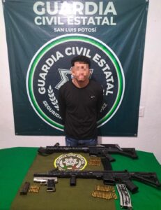 Tamuín, SLP.- Como resultado de los trabajos de seguridad y vigilancia implementados en el dispositivo “Huasteca Segura”, efectivos de la Guardia Civil Estatal (GCE) detuvieron a tres presuntos criminales integrantes de una célula delincuencial, a quienes además les aseguraron armas de grueso calibre de uso exclusivo de las fuerzas del orden público.