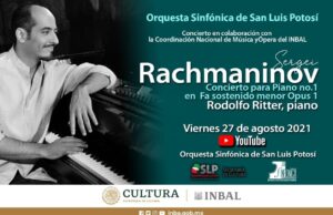Como parte de la programación virtual #CulturaVivaEnCasa, la Secretaría de Cultura de San Luis Potosí (SECULT) presenta el concierto de la Orquesta Sinfónica de San Luis (OSSLP) este viernes 27 de agosto en su canal de YouTube: bit.ly/3pEL7nV, recordando la más reciente participación del pianista Rodolfo Ritter que interpretó el Primer Concierto para Piano de Sergéi Rachmaninov, el pasado mes de julio en el Teatro de la Paz, y que se realizó en coordinación con la Coordinación Nacional de Música y Ópera del INBAL.