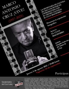La Secretaría de Cultura de San Luis Potosí (SECULT), invita al público a la inauguración de la exposición de fotografía Homenaje a “Marco Antonio Cruz Vive”, que se llevará a cabo el jueves 5 de agosto de 2021 a las 19:00 horas, en la Galería Germán Gedovius del Teatro de la Paz.