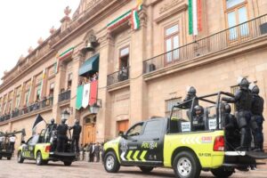 Frente al balcón de Palacio de Gobierno, las y los integrantes de la SSPC rindieron honores ante las autoridades estatales y municipales, refrendado así el compromiso de servir con orgullo a la ciudadanía.
