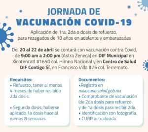 SLP.- El Sistema Municipal para el Desarrollo Integral de la Familia aplicará la vacuna contra covid-19 los días miércoles 20, jueves 21 y viernes 22 de abril, en las instalaciones de los Centros de Salud “Contigo Sí”, en Xicoténcatl y en la colonia Terremoto.