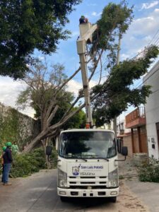 En la calle Galeana también fue intervenido un árbol que quedó partido a la mitad, otros más en el Barrio de San Miguelito, avenida Himalaya y otros en las colonias Prados, Terremoto y en el Saucito. Sobre los reportes de interrupción de alumbrado público, mencionó Azuara que se recibieron de 12 colonias, mediante la línea telefónica del propio alcalde y en las redes sociales.