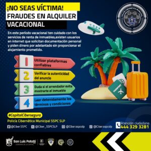 En este periodo vacacional, la Jefatura de Policía Cibernética Municipal, de la Secretaría de Seguridad y Protección Ciudadana (SSPC) ha detectado publicaciones fraudulentas que ofertan paquetes vacacionales y renta de inmuebles para descanso temporal, por lo que ha emprendido acciones de seguridad para blindar a la ciudadanía y alertar a las autoridades correspondientes de los delitos detectados en redes sociales.