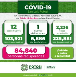 La Secretaría de Salud de San Luis Potosí y el Comité Estatal para la Seguridad en Salud, informan que, hasta este miércoles 8 de diciembre se registran 103 mil 921 casos totales de Covid-19, con la confirmación de 12 nuevos contagios en las últimas 24 horas.