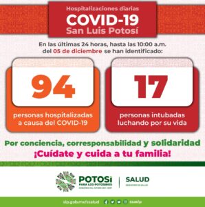 La Secretaría de Salud de San Luis Potosí y el Comité Estatal para la Seguridad en Salud, informan que hasta este domingo 5 de diciembre se registran 103 mil 755 casos totales de Covid-19, con la confirmación de 102 nuevos contagios en las últimas 24 horas.