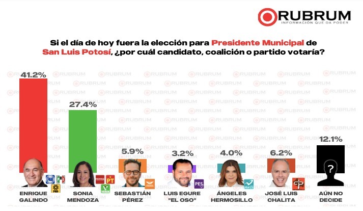 La casa encuestadora Rubrum ha revelado los resultados de su más reciente encuesta, confirmando que Enrique Galindo Ceballos, candidato de la coalición Fuerza y Corazón por San Luis, conformada por PAN, PRI y PRD, continúa liderando las preferencias electorales para la presidencia municipal de la capital potosina por tercera semana consecutiva, con un sólido 41.2 por ciento de la intención del voto.