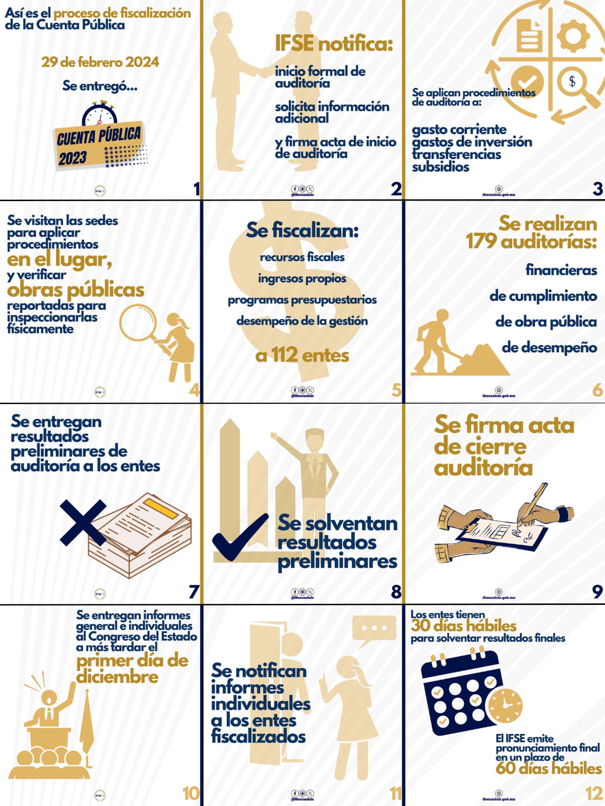 El proceso de auditoría dará comienzo el próximo mes con la firma del Acta de Inicio de Auditoría al Ejercicio 2023. Se llevarán a cabo procedimientos de auditoría planeados, así como visitas físicas a las sedes administrativas de los municipios y otras entidades de los tres poderes por fiscalizar, incluyendo las obras públicas ejecutadas durante el ejercicio 2023.