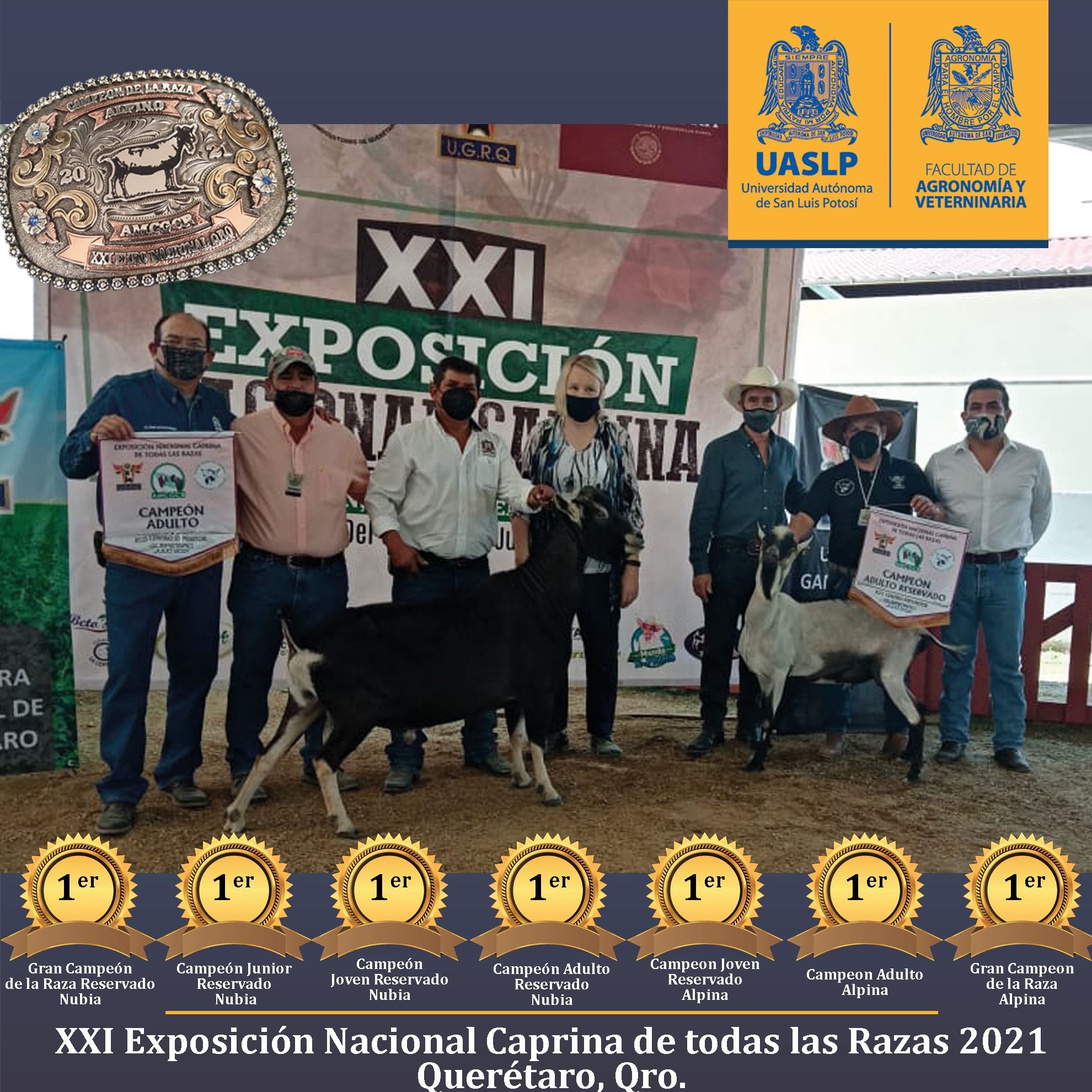 La Asociación Mexicana de Criadores de Ganado Caprino de Registro (AMCGCR) en colaboración con la Unión Ganadera Regional de Querétaro (UGRQ), efectuó la XXI Exposición Nacional Caprina de todas las Razas, evento donde destacó el ganado caprino de la Facultad de Agronomía y Veterinaria (FAV) de la UASLP, en las razas Nubia y Alpina.
