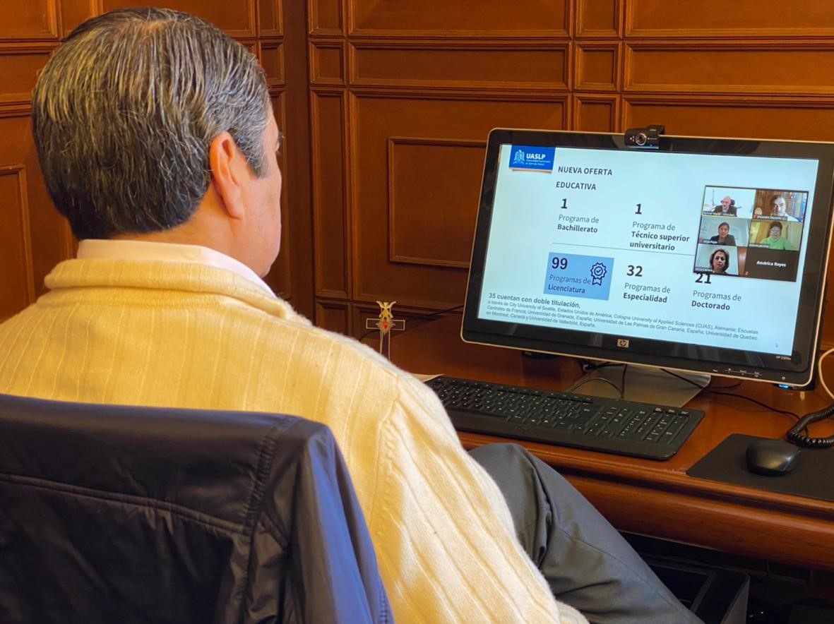 El doctor Alejandro Javier Zermeño Guerra, rector de la Universidad Autónoma de San Luis Potosí, sostuvo una reunión de trabajo virtual con directivos de la University of Applied Management Studies, en Alemania.