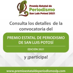 Este viernes 7 de mayo es el último día para que las y los periodistas interesados en participar en el Premio Estatal de Periodismo San Luis Potosí, edición 2021, efectúen el registro de sus trabajos ya sea de forma presencial o en línea según lo establecido en la convocatoria, así lo dio a conocer el Comité Organizador, quien hizo un llamado al gremio a enviar sus publicaciones para concursar en alguna de las 13 categorías.