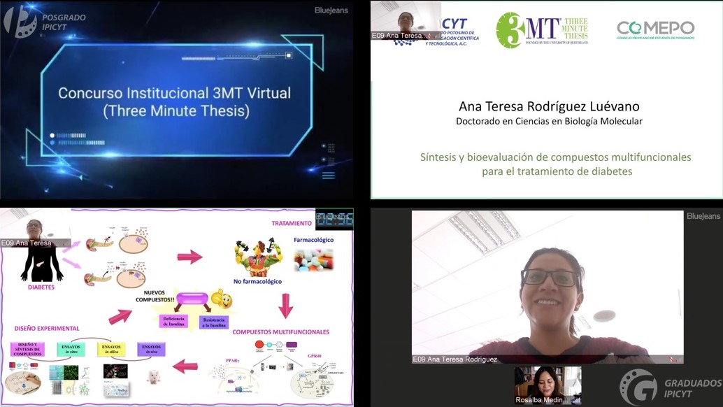 Ana Teresa Rodríguez, por decisión del Jurado Calificador, obtuvo la calidad de su presentación de tesis doctoral en un lapso de tres minutos, así como compresión en el impacto de su investigación titulada: «Síntesis y bioevaluación de compuestos multifuncionales para el tratamiento de diabetes», en la que utilizó un lenguaje sencillo y claro, con el apoyo de solo una lámina digital, ante una audiencia y jurado no especializado.
