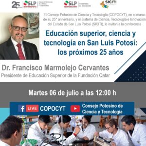 En el marco de su 25 Aniversario, el Consejo Potosino de Ciencia y Tecnología (COPOCYT) invita a participar en la conferencia que se realizará el martes 6 de julio de 2021 a las 12:00 horas, con el objetivo de abordar los retos y oportunidades de la educación superior, la ciencia y la tecnología en San Luis Potosí para los próximos años.