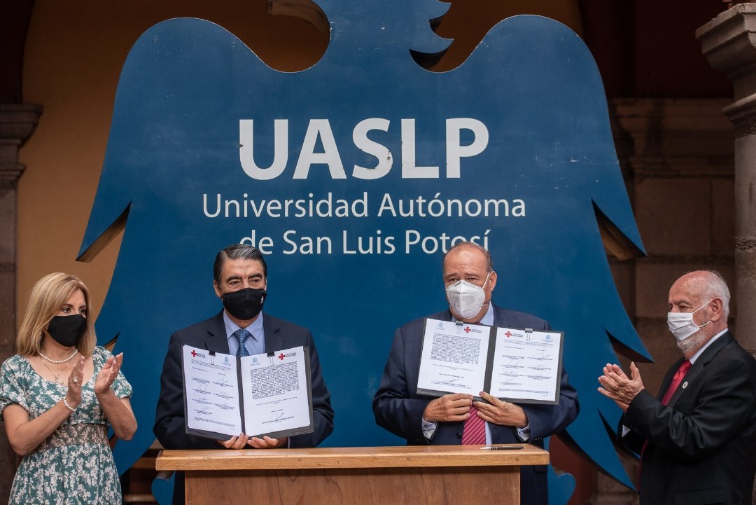 El evento tuvo lugar en el patio del edificio central, por parte de la UASLP, rubricó el documento, el rector, Dr. Alejandro Zermeño Guerra, y por la Cruz Roja Mexicana, el Lic. Fernando Suinaga Cárdenas, presidente del Consejo Nacional; a su vez, el Lic. José Antonio Monroy Serment, director general de Cruz Roja Mexicana; el delegado estatal, Lic. Jesús Ernesto de la Maza Jiménez; y el C.P. Luis Alfredo Alonso Valdivia subdelegado estatal de la Cruz Roja.