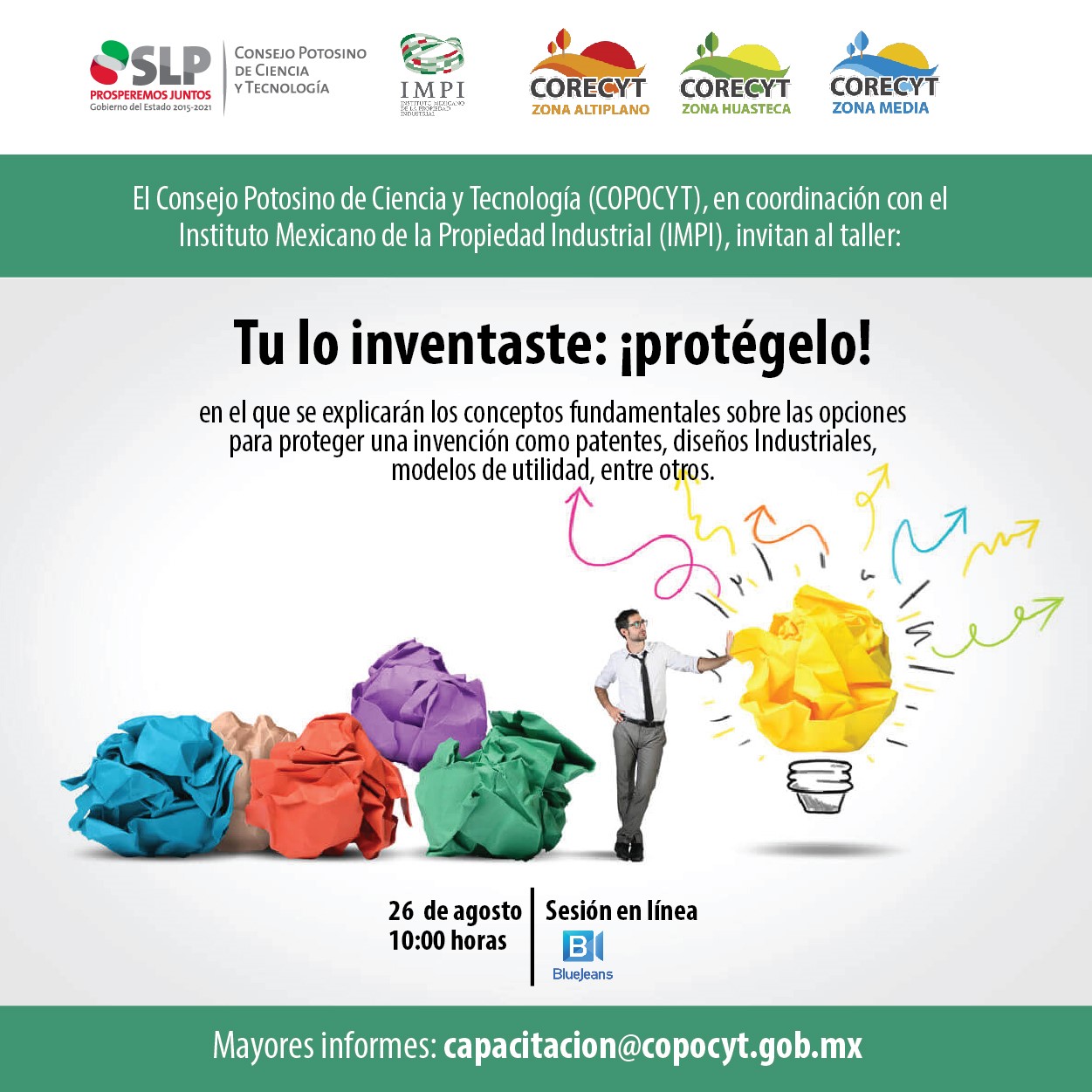 El Consejo Potosino de Ciencia y Tecnología (COPOCYT), realizará una serie de talleres que impartirá el Instituto Mexicano de la Propiedad Industrial (IMPI); el primero de ellos con el título “Tu lo inventaste: ¡protégelo!”, se realizará el próximo 26 y 27 de agosto de 2020, completamente en línea mediante la plataforma BlueJeans, informó la directora general, Rosalba Medina Rivera.