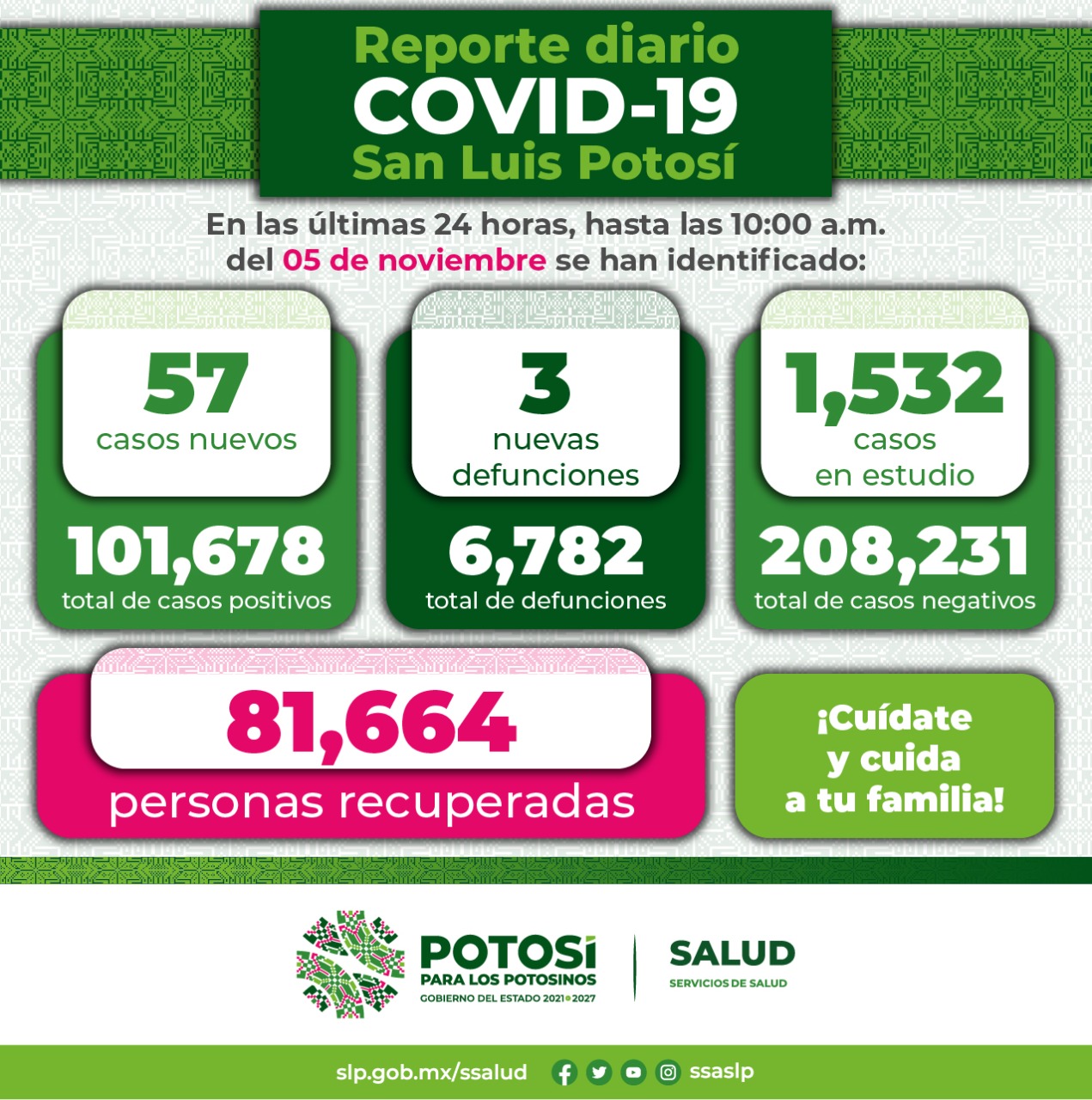 Los Servicios de Salud y el Comité Estatal para la Seguridad en Salud, informan que hasta este viernes 5 de noviembre, se registran 101 mil 678 casos totales de Covid-19, con la confirmación de 57 nuevos contagios de acuerdo al reporte epidemiológico de las últimas 24 horas.