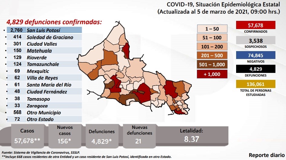 Se presentaron 156 nuevos casos para llegar a 57 mil 678 confirmados de 136 mil 061 personas estudiadas, de las que se han descartado 74 mil 845; la cifra de pendientes de estudio es de 3 mil 538 sospechosos, y el número de decesos subió a 4 mil 829 con un índice de letalidad de 8.37 decesos por cada 100 casos.