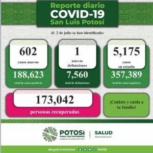 Aumenta la cifra de muertes a 7 mil 560, al reportarse el primer deceso en el mes de julio. La defunción fue en una mujer de 74 años, contaba con esquema completo de vacunación, con diabetes como comorbilidad además de contar con factor de riesgo la edad. Sobre los estudios de nuevos casos, 353 son mujeres y 249 hombres en un rango de edad de 4 meses a 97 años. Se encuentran hospitalizadas 22 personas, de las que una requiere de respiración asistida.