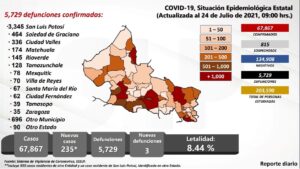 En el reporte de este día se dio a conocer que 235 personas contrajeron COVID-19, para un total de 67 mil 867 confirmados, así como 3 defunciones para un acumulado de 5 mil 729 fallecimientos a causa de esta enfermedad, con una tasa de letalidad de 8.44 por ciento.