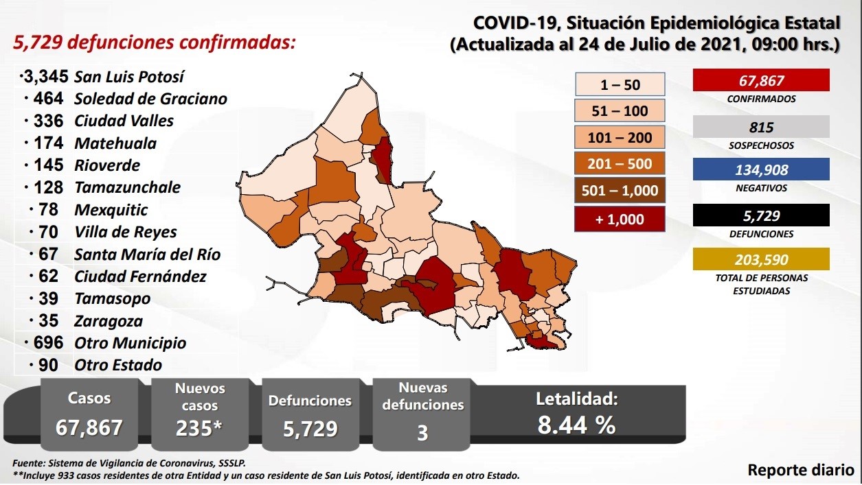 En el reporte diario, se detalla que los contagios tiene su mayor incidencia en la capital del Estado con 85 casos, 5 en Soledad de Graciano Sánchez, 9 en Matehuala, 6 en Charcas, 2 en Villa de Guadalupe, 2 en Santa María, 6 en Villa de Arista, 1 en Salinas, 1 en Villa de Arriaga, 9 en Villa de Reyes, 15 en Ciudad Fernández, 13 en Rioverde, 1 en Cárdenas, 1 en Cerritos, 23 en Ciudad Valles, 1 en Ébano, 4 en Tamuín, 11 en Tamazunchale, 19 en Matlapa, 8 en San Martín, 4 en Xilitla, 1 en Coxcatlán, 1 en Huehuetlán, 3 en Tanquián y 4 procedentes de otros estados.