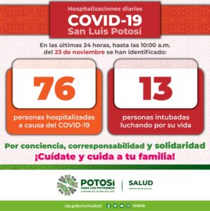 El Secretario de Salud del Estado, dijo que las próximas cuatro semanas son cruciales en las que debemos mantener los cuidados para poder cruzar sanos, parte del invierno, redoblando esfuerzos en nuestros cuidados, evitando reuniones familiares o acudiendo a lugares con concentración masiva de personas acompañados de menores de edad y personas de la tercera edad, utilizar en todo momento el cubrebocas, ejercer la sana distancia y realizar regularmente el lavado de manos.
