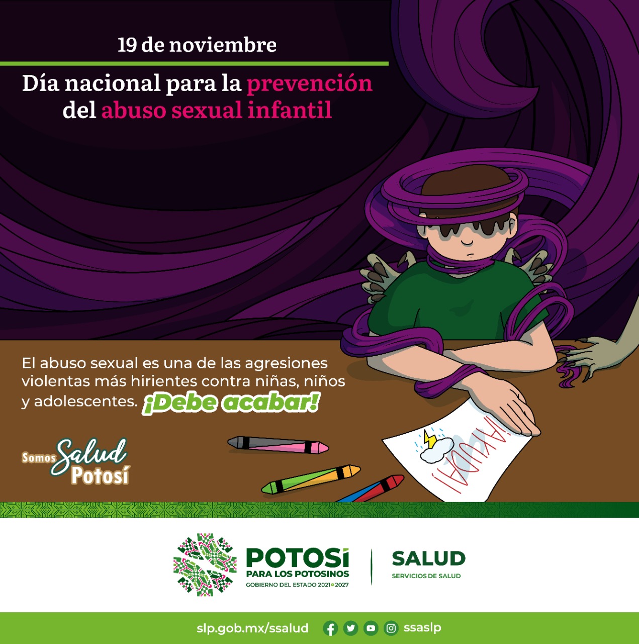 La violencia sexual infantil puede suceder en todos los espacios en los que niñas, niños y adolescentes interactúan en contextos como la escuela, el vecindario y en el ámbito familiar. Generalmente, las víctimas son adolescentes, niñas y niños mayores de cinco años, pero también les sucede a niños menores de cinco años. Es por ello que en el marco del 19 de noviembre “Día Nacional para la Prevención del Abuso Sexual Infantil”, los Servicios de Salud quieren dar a conocer la importancia de la Prevención del Maltrato en el ámbito familiar como parte de las acciones primordiales de salud en la infancia.