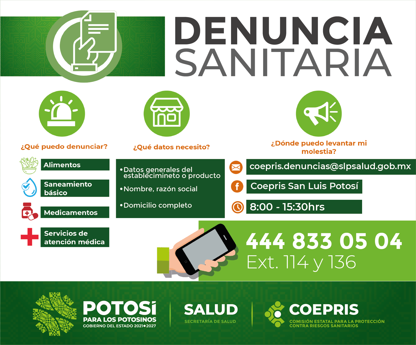 La Denuncia Sanitaria tiene por objeto, poner de conocimiento a la autoridad los hechos, actos u omisiones en materia sanitaria que de acuerdo a la perspectiva del denunciante, provoque un riesgo o daño a la salud de la población; la queja puede enviarse al correo electrónico coepris.denuncias@slpsalud.gob.mx. en la página http://coepris.slpsalud.gob.mx o bien, directamente en la ventanilla de los siete Centros Integrales de Servicios ubicados para el interior del estado en las instalaciones de las Jurisdicciones Sanitarias y para la capital potosina, el Centro Integral se encuentra en las instalaciones de la COEPRIS ubicadas en la calle 05 de mayo No. 1485, Barrio de San Miguelito.