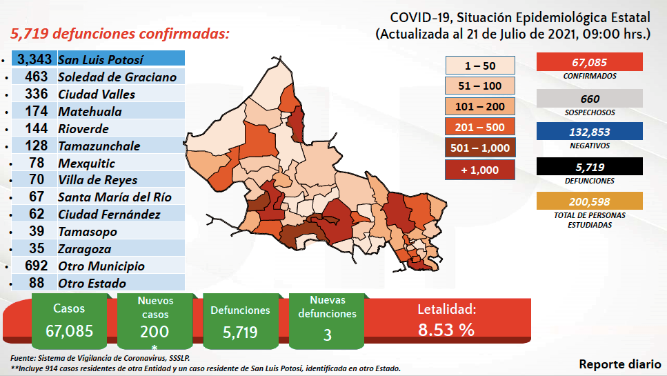 En el reporte técnico se informó que este día se presentaron 200 nuevos casos para llegar a 67 mil 085 confirmados de 200 mil 598 personas estudiadas; se han descartado 132 mil 853 personas y la cifra de pendientes de estudio es de 660 sospechosas. Los decesos subieron a 5 mil 719.