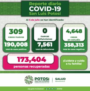 El Comité Estatal para la Seguridad en Salud y los Servicios de Salud informan que en cuanto al Informe Diario de casos Covid-19, se dan a conocer 309 nuevos contagios confirmados en la Entidad, sumando hasta este 5 de julio, 190 mil 008 casos totales de este padecimiento.