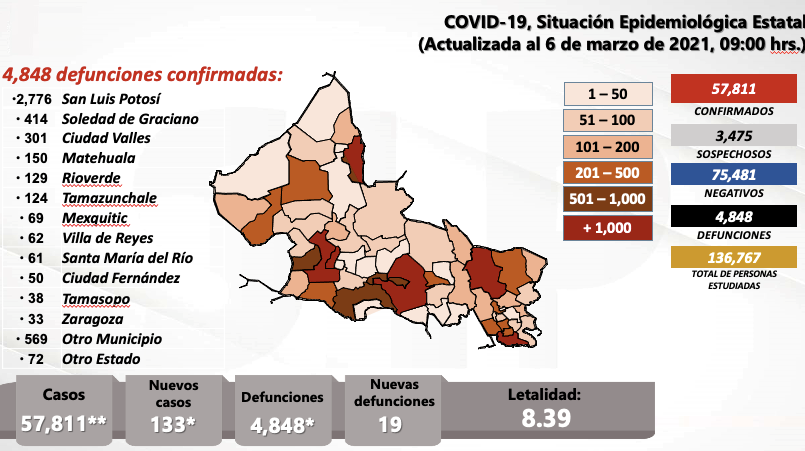Este día se presentaron 133 nuevos casos para llegar a 57 mil 811 confirmados de 136 mil 767 personas estudiadas, de las que se han descartado 74 mil 481; la cifra de pendientes de estudio es de 3 mil 475 sospechosos, y el número de decesos subió a 4 mil 848 con un índice de letalidad de 8.37 decesos por cada 100 casos.