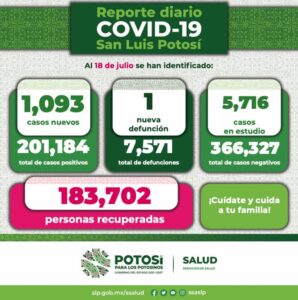 En cuanto al informe Covid-19 transmitido en vivo, el Secretario de Salud a nombre del Comité Estatal para la Seguridad en Salud y los Servicios de Salud dio a conocer que, fueron confirmados 1 mil 093 nuevos contagios, sumando en el Estado 201 mil 184 casos totales de este padecimiento.