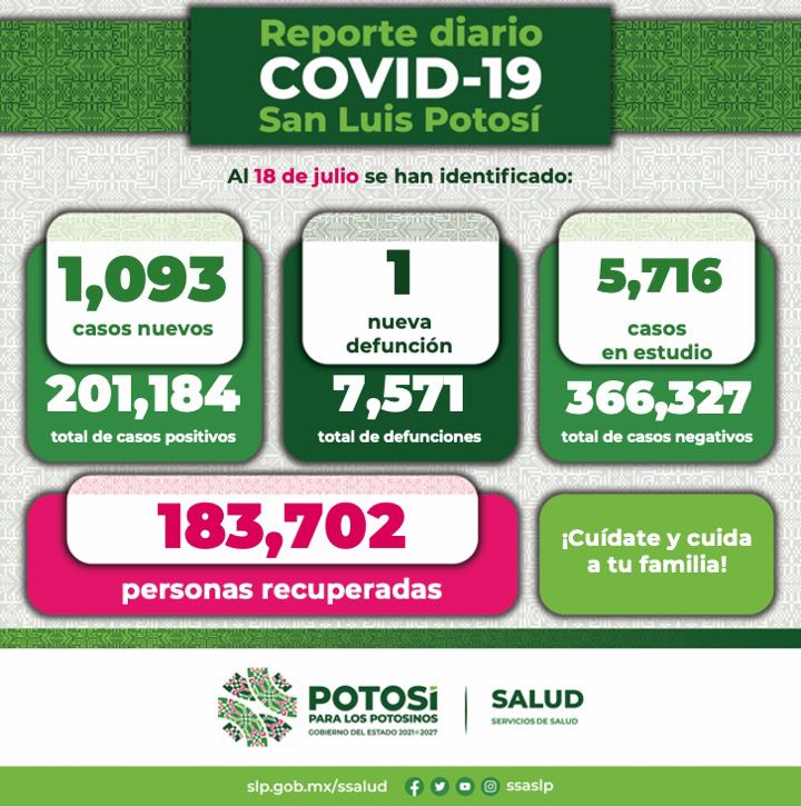 Se registraron 704 de los nuevos contagios en la Jurisdicción Sanitaria I; 58, en la Jurisdicción Sanitaria II de Matehuala; 46, en la Jurisdicción Sanitaria III de Villa de Pozos; 104, en la Jurisdicción Sanitaria IV de Rioverde; 101, en la Jurisdicción Sanitaria V de Ciudad Valles; 52, en la Jurisdicción Sanitaria VI de Tamazunchale; 10, en la Jurisdicción Sanitaria VII de Tancanhuitz; mientras que en personas residentes de otra entidad, se registraron 18 nuevos casos.