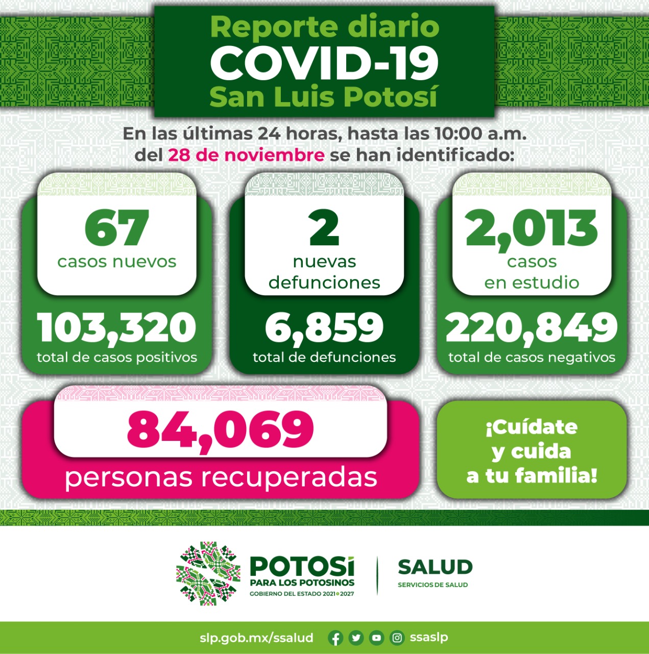 Los Servicios de Salud y el Comité Estatal para la Seguridad en Salud, informan que, hasta este domingo 28 de noviembre se registran 103 mil 320 casos totales de Covid-19, con la confirmación de 67 nuevos contagios de acuerdo al reporte epidemiológico de las últimas 24 horas.